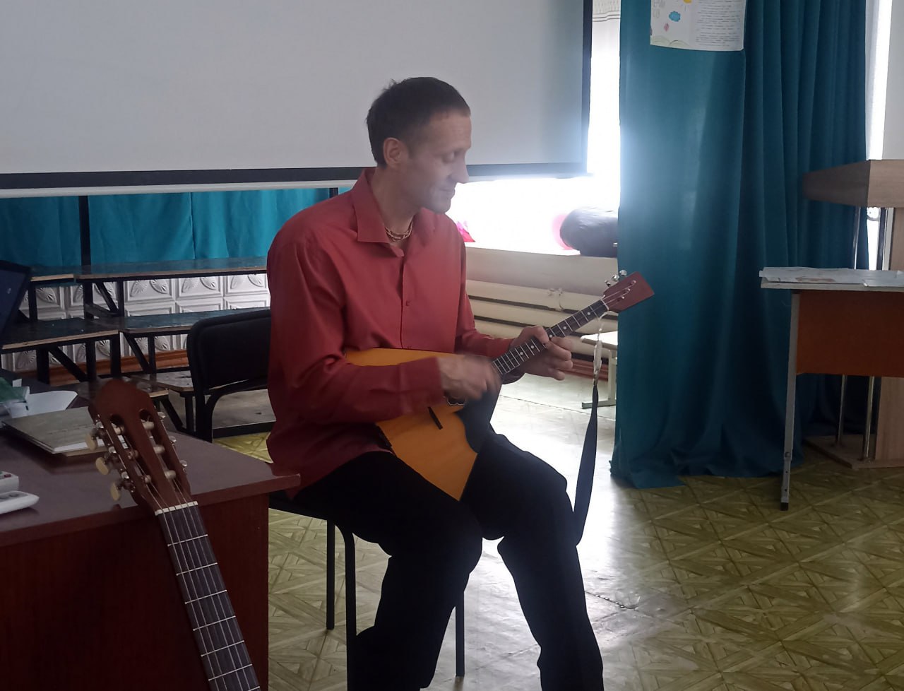 Анатолий Казак, автор проекта «К истокам русской культуры», исполнил на балалайке мелодии знаменитых песен о России, школьной поре и народных песен.