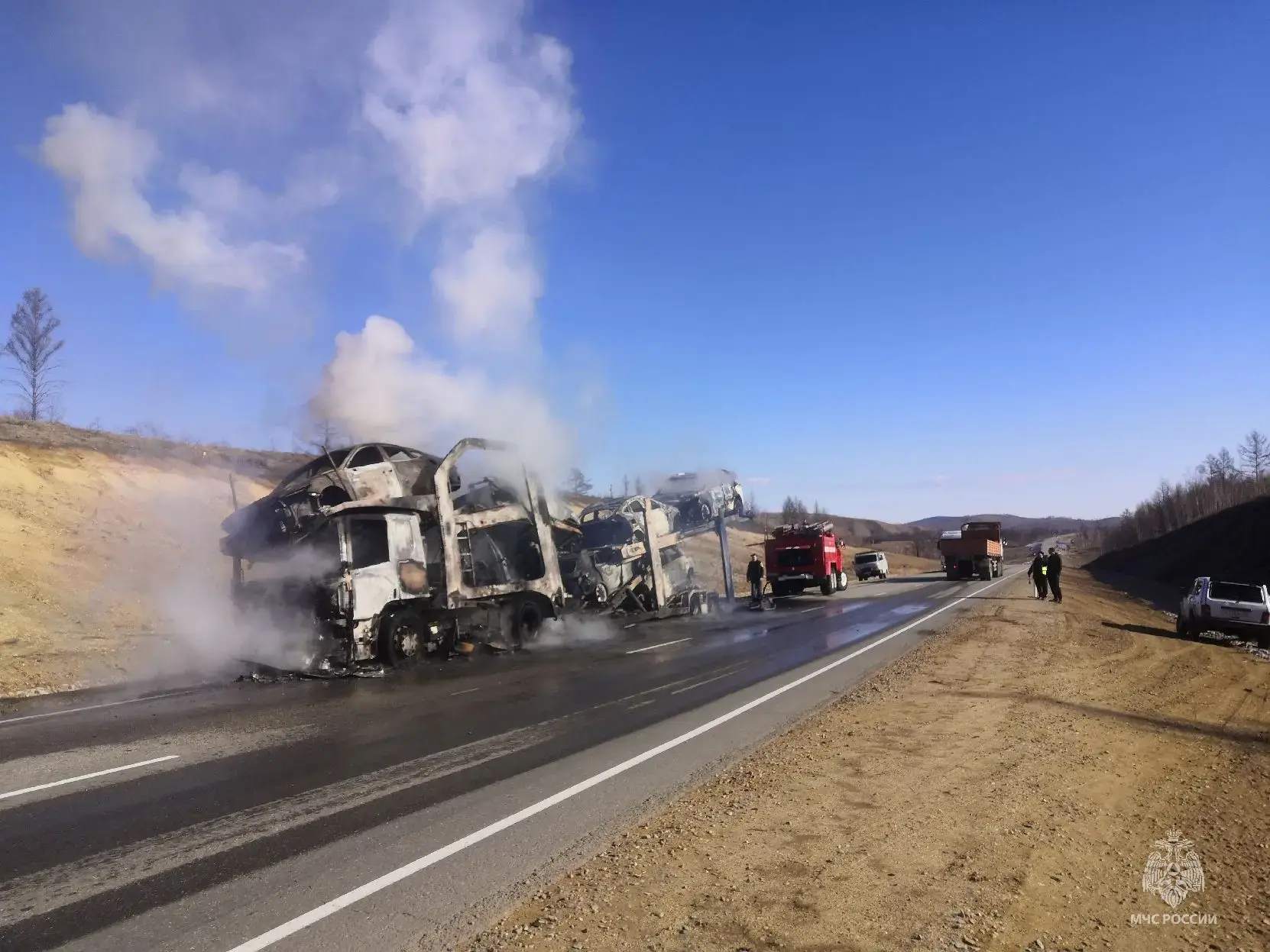 На 333 километре федеральной трассы Амур огнеборцы пожарно-спасательной части № 38 ликвидировали возгорание автовоза с легковыми автомобилями.