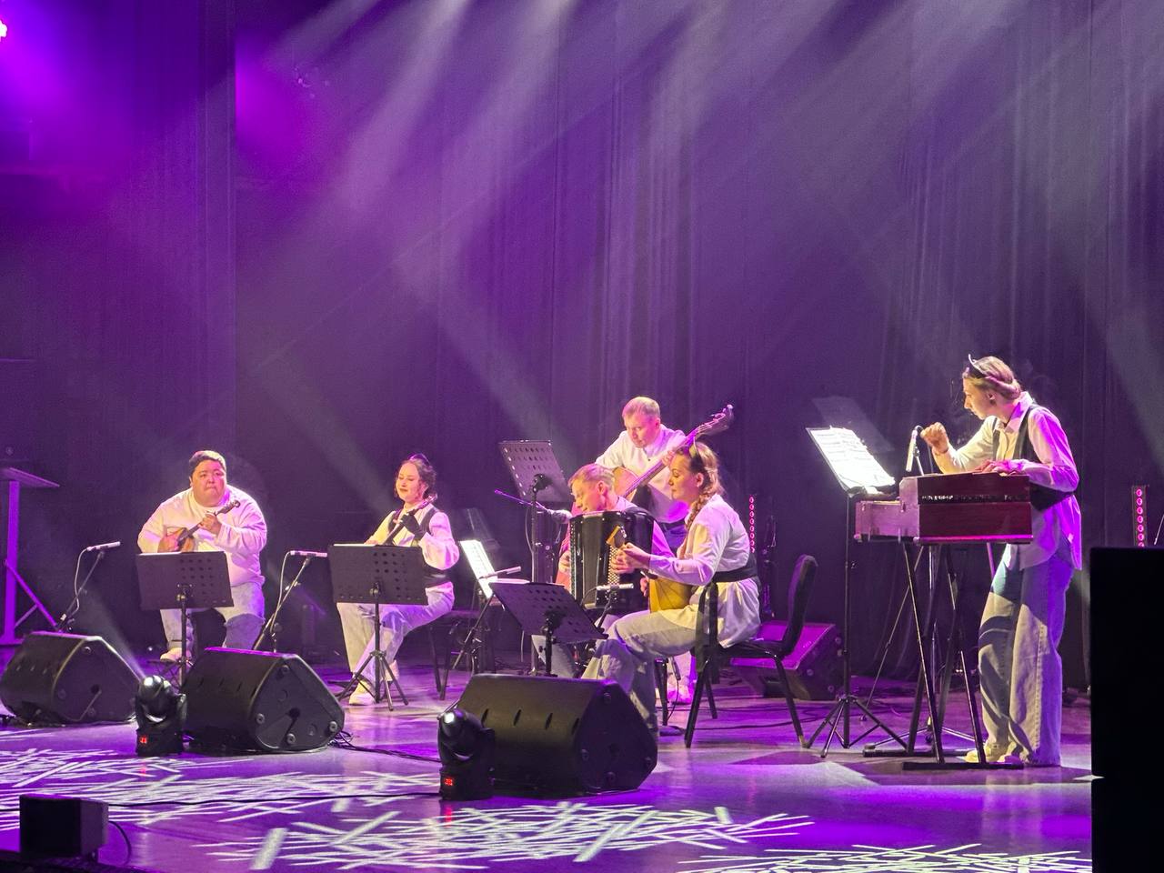Со сцены они сыграли на звонких гуслях, виртуозной домре, балалайке и баяне. Музыканты исполнили произведение «Фантазия на две русские народные песни» композитора Веры Городовской, а также мелодию «Гляжу в озёра синие» в обработке балалаечника Евгения Тростянского.