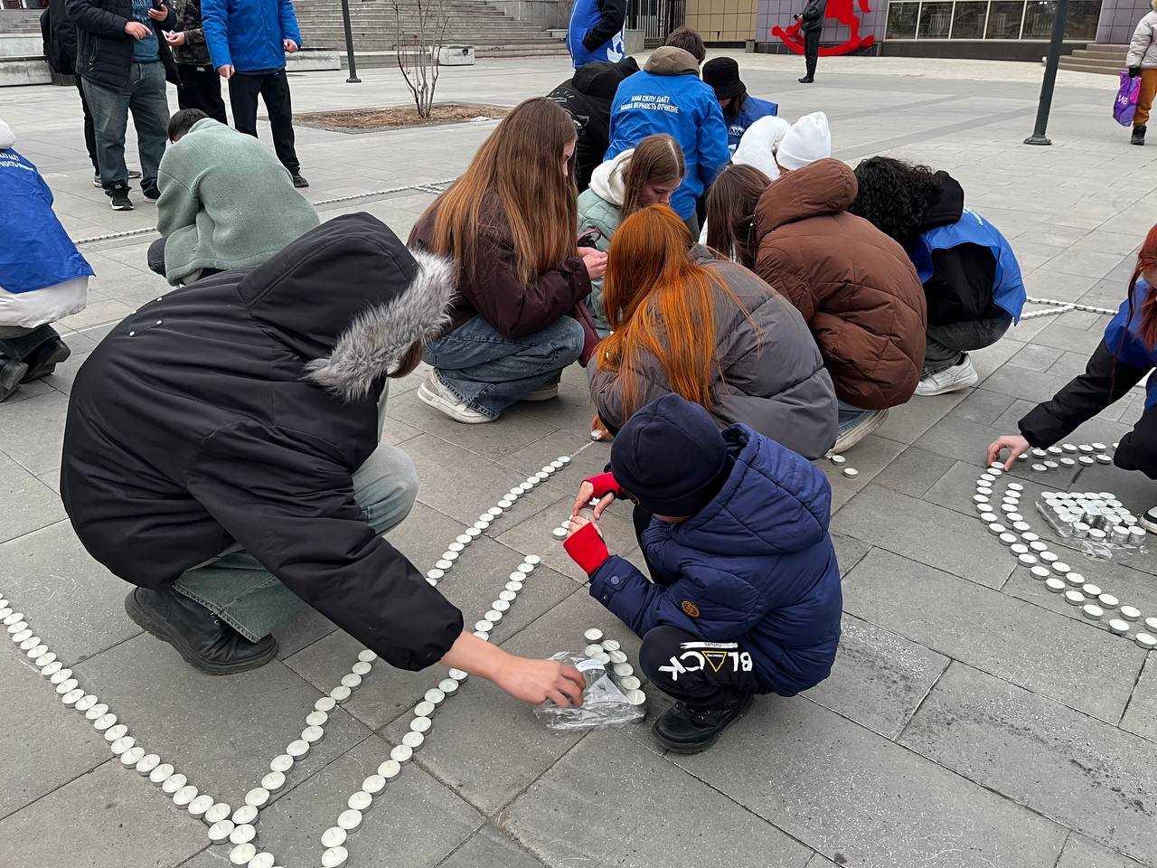 В мероприятии участвуют молодежь, депутаты, участники спецоперации и все желающие. Все они дружно собирали ракету, а сейчас все вместе зажигают свечи.