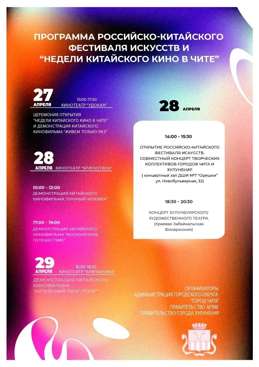 В Чите в третий раз проводится Неделя китайского кино. В нынешнем году она будет усилена Российско-китайским Фестивалем искусств, в рамках которого в Читу приедете профессиональный художественный театр города Хулунбуир. Все мероприятия организованы администрацией Читы, правительством Хулунбуира и правительством Автономного района Внутренняя Монголия (КНР).
