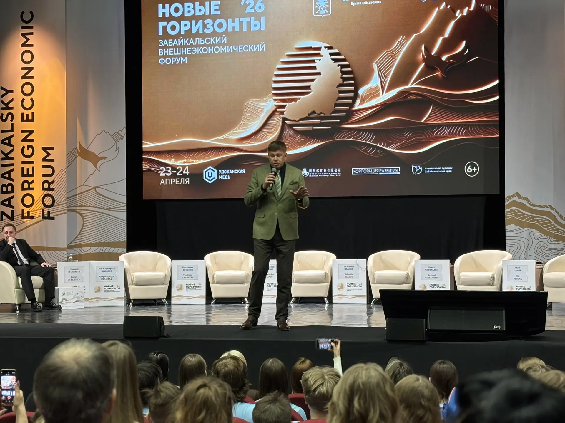 Во время Забайкальского внешнеэкономического форума «Новые горизонты – 2026» в Забайкальском краевом драматическом театре прошла творческая встреча с известным спортивным комментатором Дмитрием Губерниевым. Мероприятие собрало забайкальцев различных возрастов: школьников-биатлонистов и их тренеров, любителей спорта.