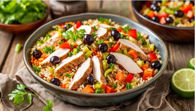 Для композиции берутся свежие овощи: морковь крупной тёркой, сладкий перец кубиками, сельдерей ломтиками, лук тонкими полукольцами. Мясо птицы нарезают кубиками, маслины — пополам, а затем всё соединяют с рисом и заправкой. Листья салата добавляются незадолго до подачи, чтобы сохранить текстуру и цвет.