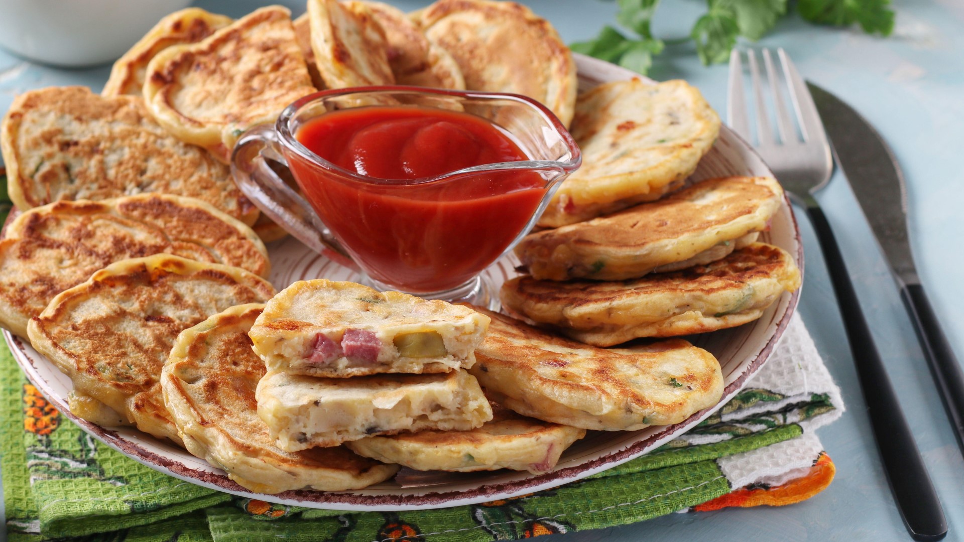 Вам понадобятся: 100 граммов ветчины, четверть болгарского перца, 70 граммов сыра, 500 миллилитров кефира и четыре пера зеленого лука. Также возьмите два яйца, половину чайной ложки соли, 350 граммов муки, одну чайную ложку соды и 50 миллилитров растительного масла.