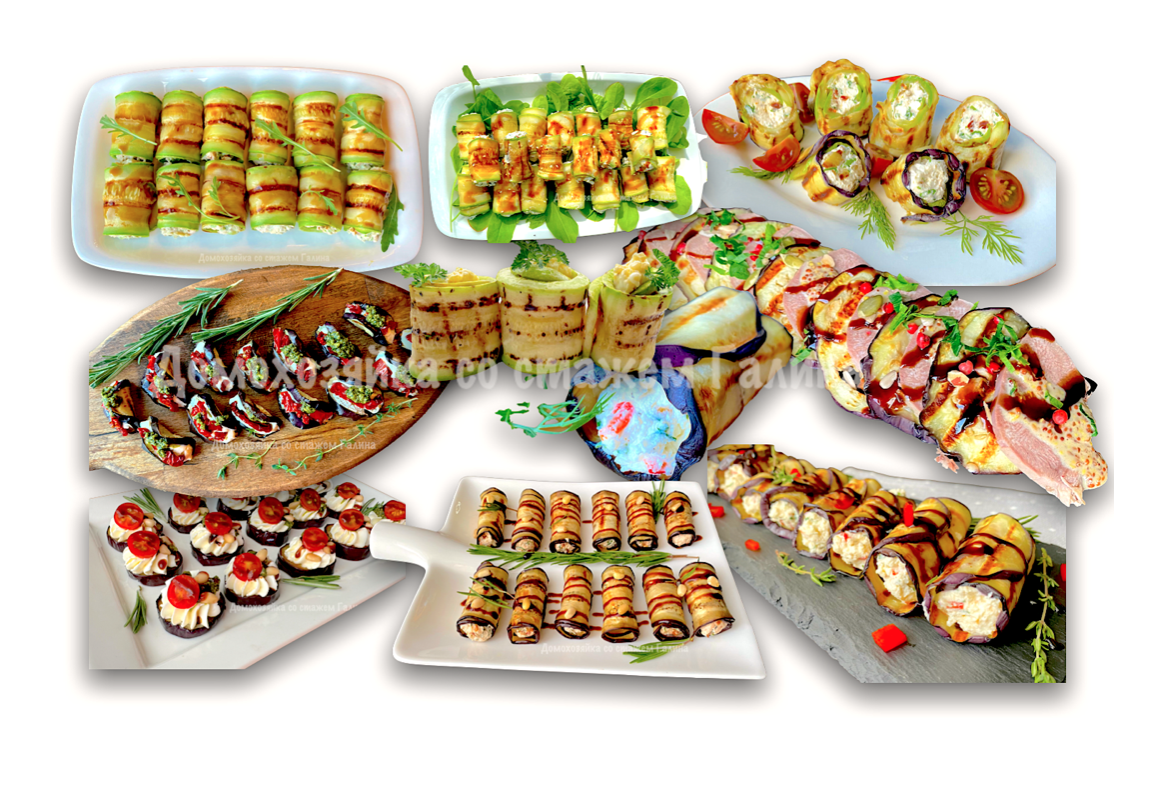 - Баклажанные рулетики: Баклажаны нарезают тонкими ломтиками и обжаривают. Затем на один край кладут начинку из творожного сыра, вяленых помидоров и орехов, сворачивают в рулетик, выкладывают на блюдо и поливают бальзамическим соусом.