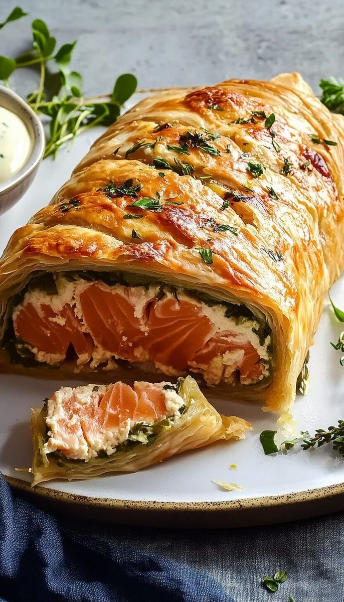 Это блюдо является настоящей жемчужиной праздничного меню, напоминая о знаменитом «Веллингтоне», но с легким штрихом рыбы. Хрустящее тесто сохраняет все соки, позволяя нежному лососю медленно пропитываться ароматами, убаюкивая его на мягкой подушке из шпината.