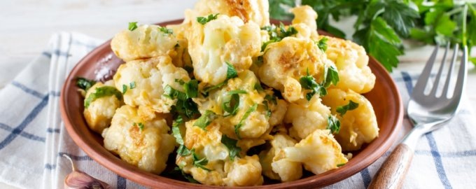 Обжаренную цветную капусту аккуратно выньте шумовкой и разложите по тарелкам. Для подачи можно предложить сметану, горчицу или острый соус из хрена. Также отлично подойдут свежие нарезанные овощи как гарнир.