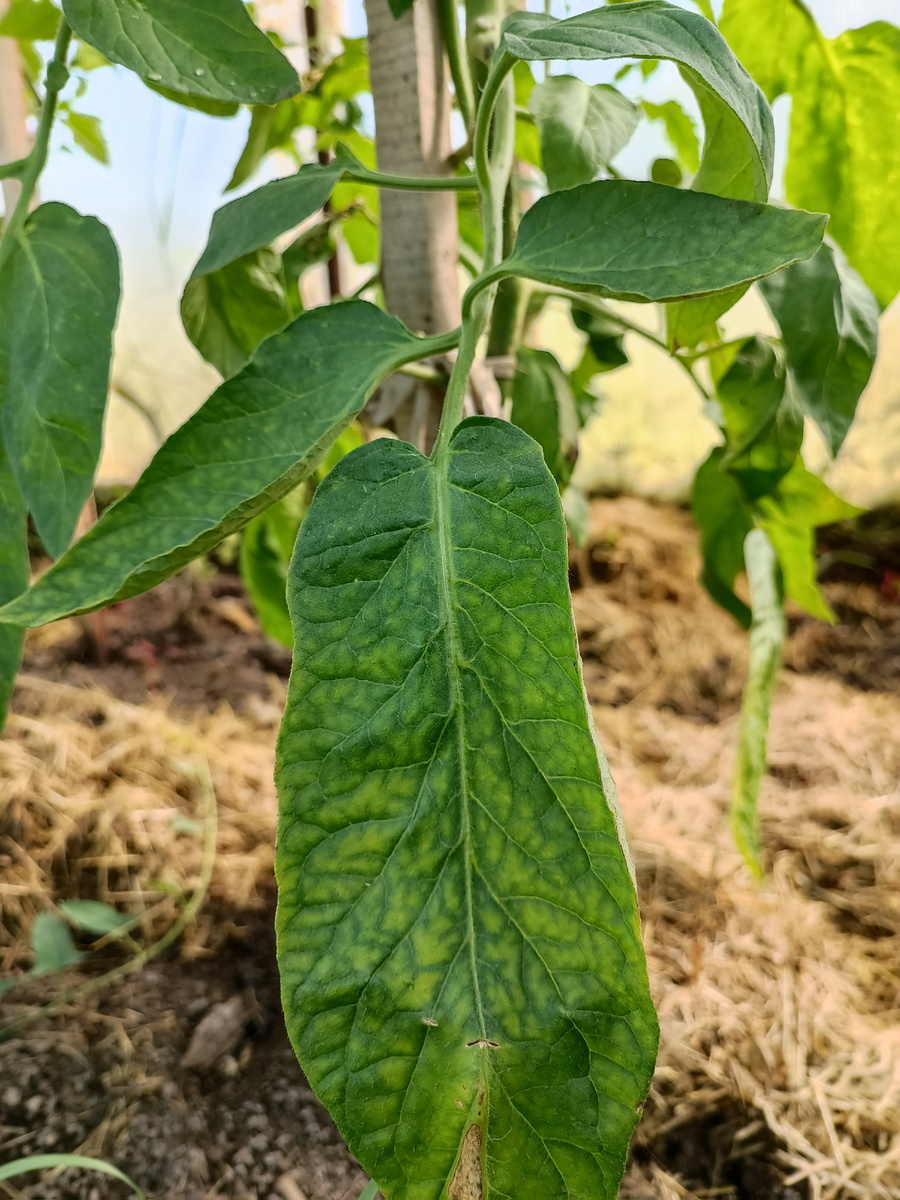 При запущенных симптомах можно наблюдать некротические пятна между жилками и преждевременное опадение листьев.