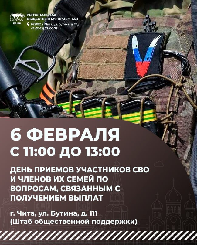 Прием пройдет по адресу: г. Чита, ул. Бутина, д. 111, кабинет 12 (Региональная общественная приемная партии «Единая Россия»).