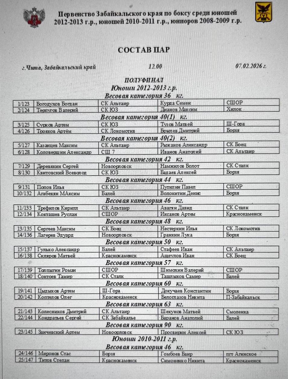 Состав пар на четвертый день первенства Забайкальского края по боксу среди: