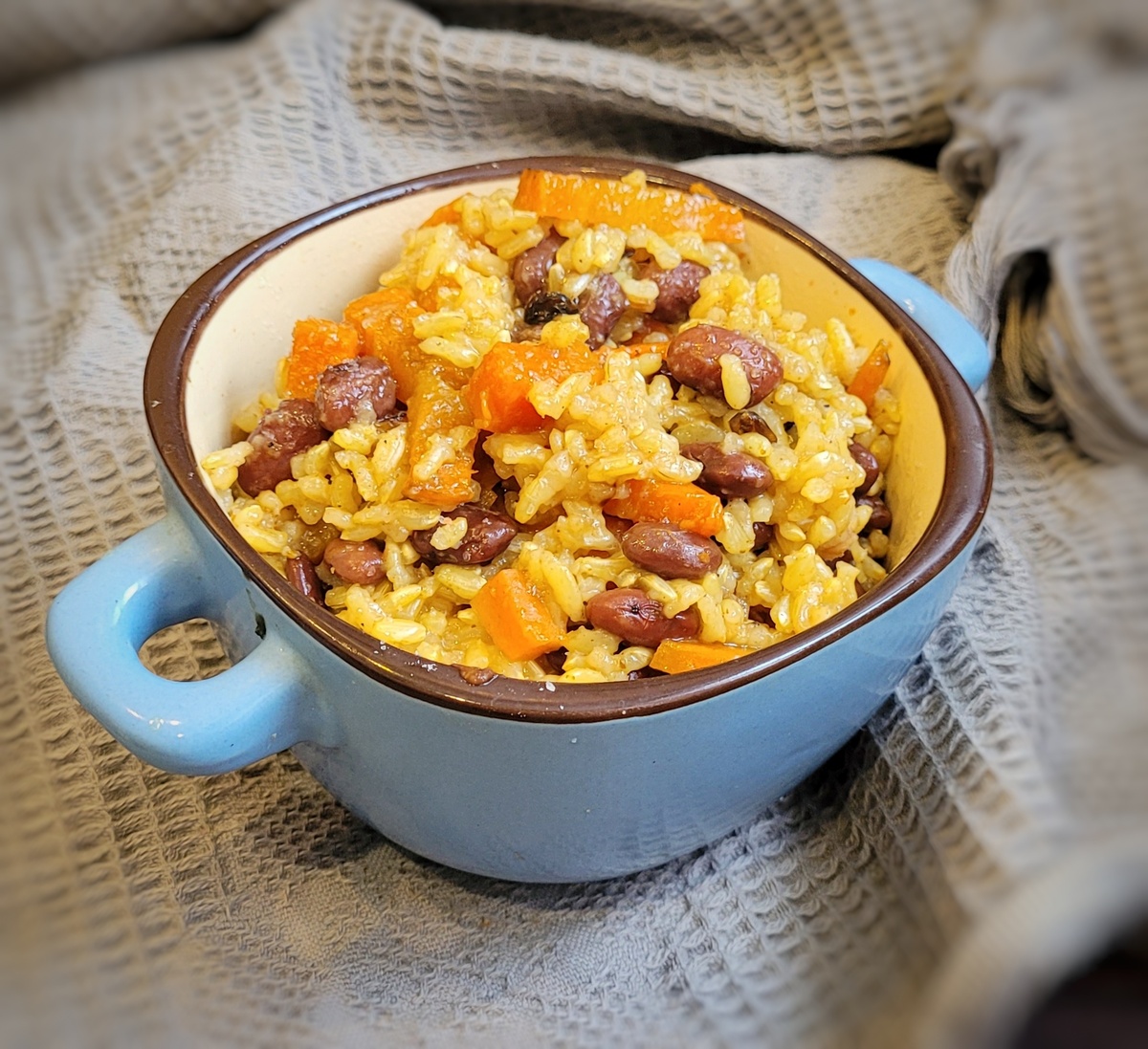 Плавное обжаривание лука и моркови запускает сладкие ноты, затем лезет чеснок и специи, придавая блюду характер. Рис добавляется с небольшим количеством воды, чтобы каждый зернышко пропитался, а потом помимо риса в казанок отправляется уже приготовленная фасоль и нарезанные томаты. Все это тушится под крышкой до готовности, позволив рису впитать ароматы и сохранить ощущение домашней теплотой.