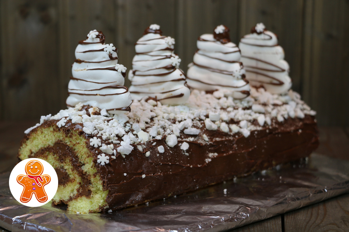 Безе добавляет лёгкость и украшение: графика ёлочек из взбитых белков, сушённых в духовке, создаёт праздничную атмосферу. Деревянные зубочистки помогают ёлочкам надёжно зафиксироваться на рулете, а маленькая крошка из оставшейся части безе добавляет текстуру центру изделия.