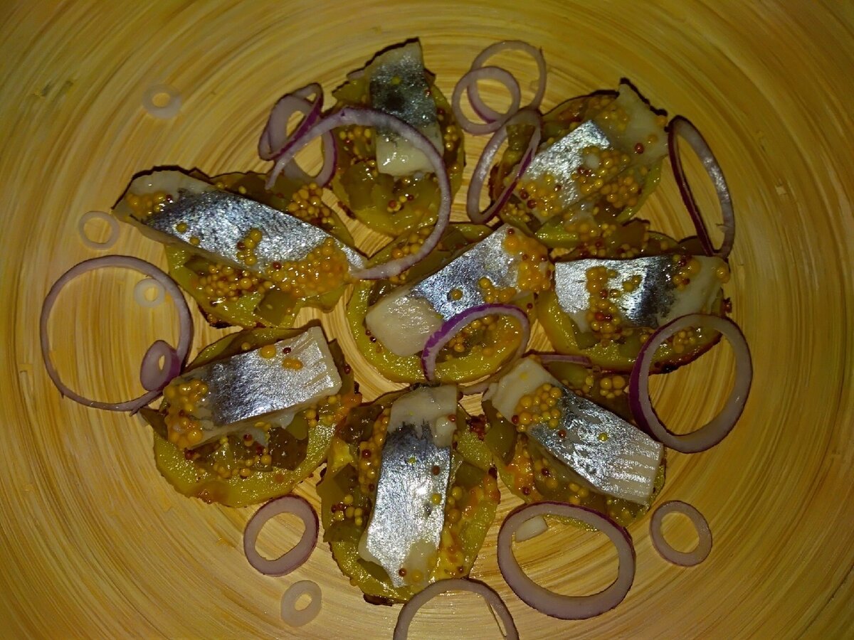 Пока картофель готовится, филе сельди стоит заправить оставшейся горчицей, а маринованные огурцы нарезать и приправить двумя ложками горчицы. Как только картофель приготовится, пора приступать к финальной сборке закуски. На ломтик запеченного картофеля укладывается чайная ложечка маринованных огурчиков, а сверху – кусочек сельди, создавая гармоничное сочетание вкусов.
