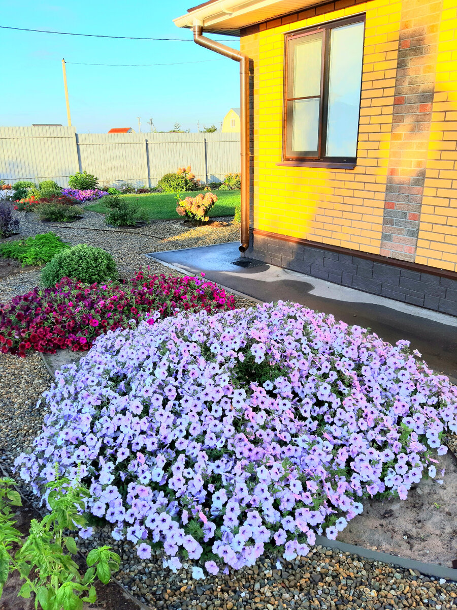 Петунии — настоящие мастера по созданию цветных палитр. Их оттенки варьируются от ярко-розового до глубокого сиреневого, привлекая внимание всех, кто проходит мимо. На фоне гиганта Сильвера соседствует петуния тайдал Ред Велюр, с бархатистыми цветками, от малиново-красного до темного бордо. Весной оба экземпляра выглядели скромно, но сейчас их невозможно не заметить. Эти цветы кажутся настоящими коврами из ярких соцветий, которые прекрасно украшают сад.