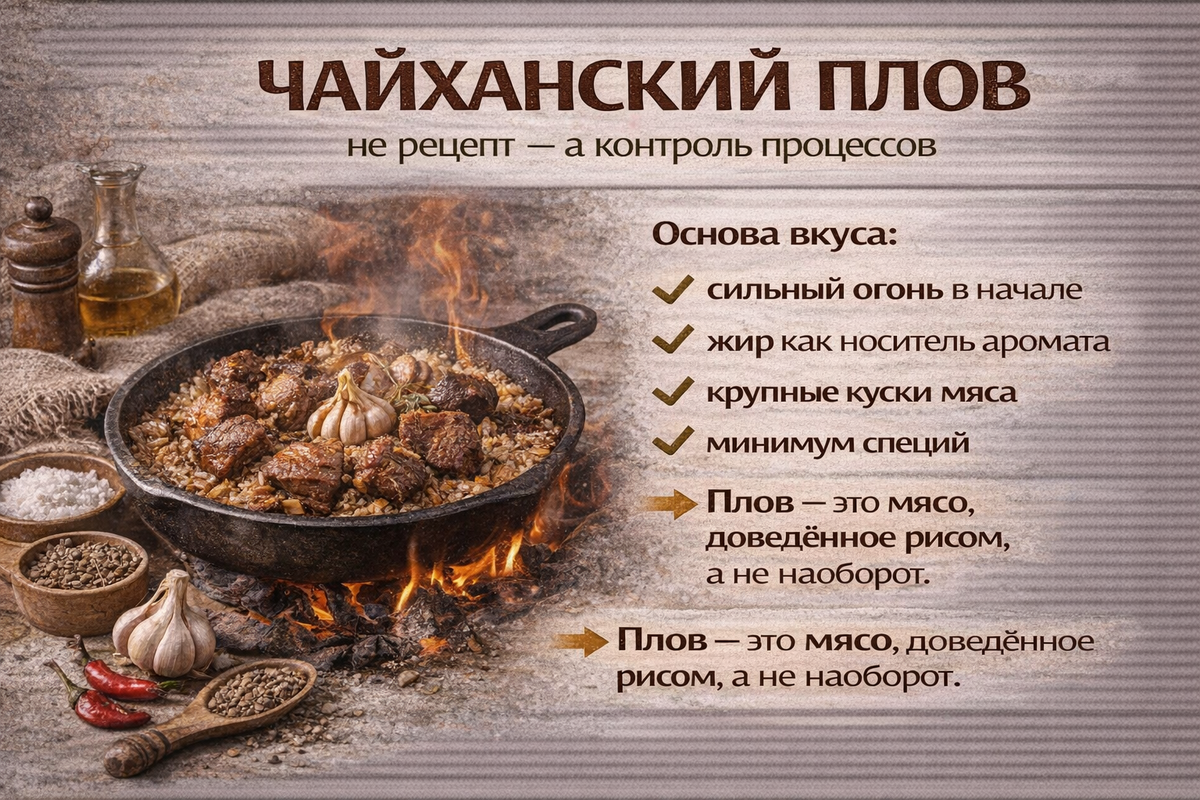 Плов — это не просто блюдо, это настоящая кулинарная магия, в которой важно учитывать каждый нюанс. Чайханский плов — это своеобразный ритуал, где контроль над огнем, жиром и временем превращается в настоящую гастрономическую симфонию.
