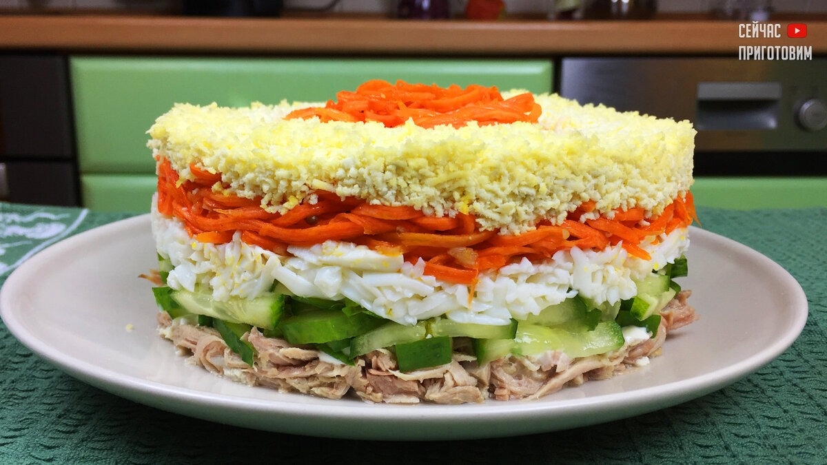 Этот салат создан для настоящих гурманов. В нем гармонично сочетаются: нежная курица, хрустящие огурцы и сочная морковь, придающая блюду особую пикантность. При этом на его приготовление уйдет всего 20 минут, а эффект, который он производит, не оставит равнодушным никого!