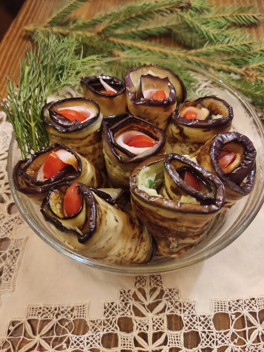 Карбонад нарезают тонкими ломтиками, помидоры — дольками. Теперь можно собирать рулетики: на каждый слайс баклажана выкладывают начинку, добавляют пластинку карбонада и ломтик помидора. Закручивают рулет от помидора к сырной начинке, стараясь завернуть помидор внутрь. Указанного количества продуктов хватит на два больших баклажана, если нарезать ингредиенты тонко.