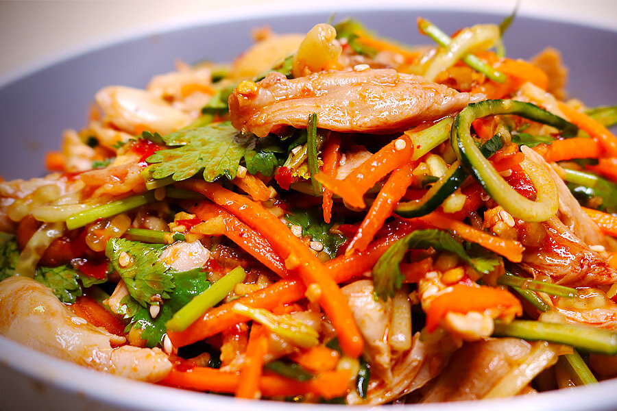 Это восхитительное сочетание свежих овощей и ароматного куриного мяса позволит насладиться уникальным вкусом сычуаньской кухни. Такой салат не только порадует глаз, но и удовлетворит самые разнообразные гастрономические предпочтения, пишет Китай на вкус.