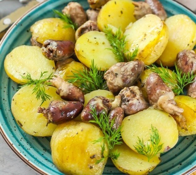 Нежная картошка с куриными сердечками в духовке - просто и вкусно