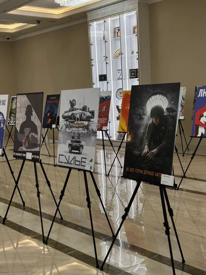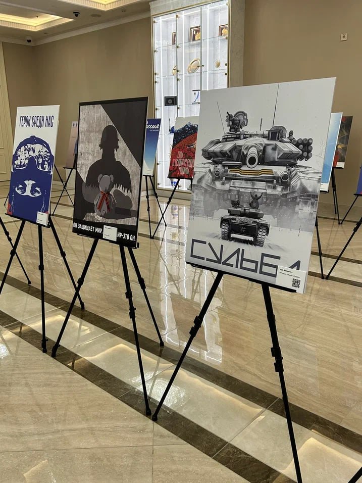 Зрителям представили более 30 плакатов на социально-патриотическую тему. «Тень обещания» Софьи Соловьевой вошла в их число. Автор изобразила мягкую игрушку с бантом в цветах Георгиевской ленты, которая «смотрит» на силуэт бойца в каске.