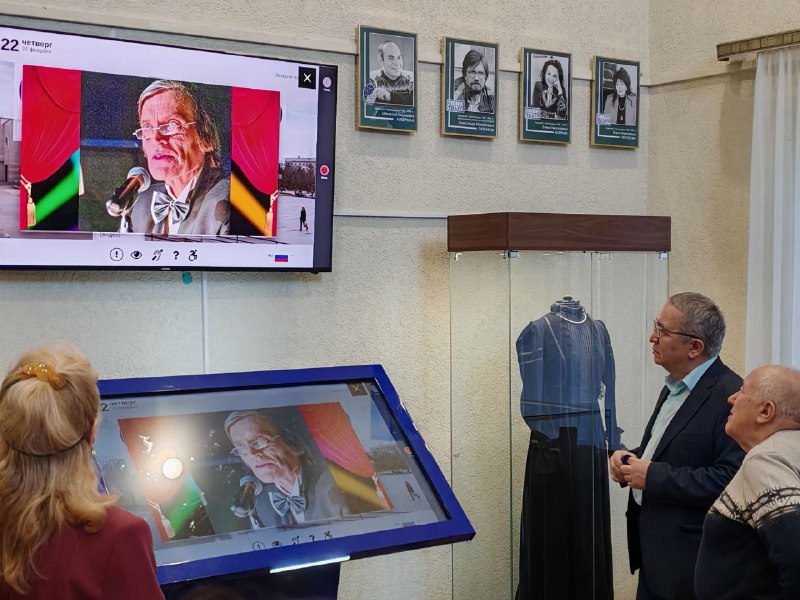 Первую экскурсию для гостей провела заслуженная артистка России Екатерина Рябова. Она не только познакомила с наполнением музея – костюмами и реквизитом в витринах, но и показала на большом экране часть материала, загруженного в электронный киоск.