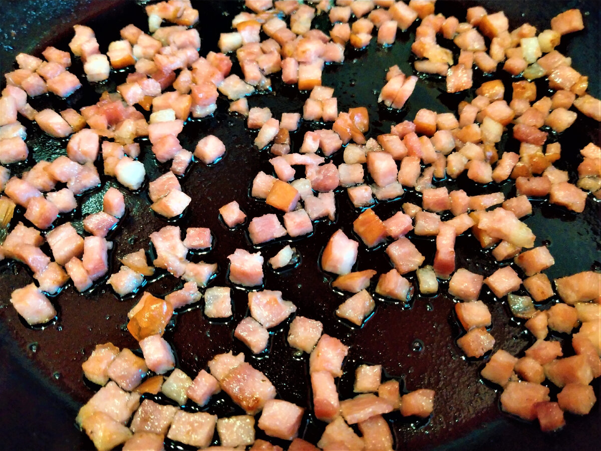 3. Ветчину нарезать кубиками и обжарить на небольшом количестве растительного масла до румяного цвета.