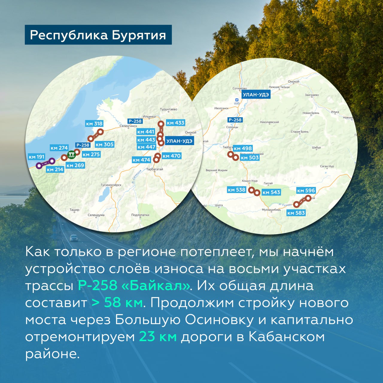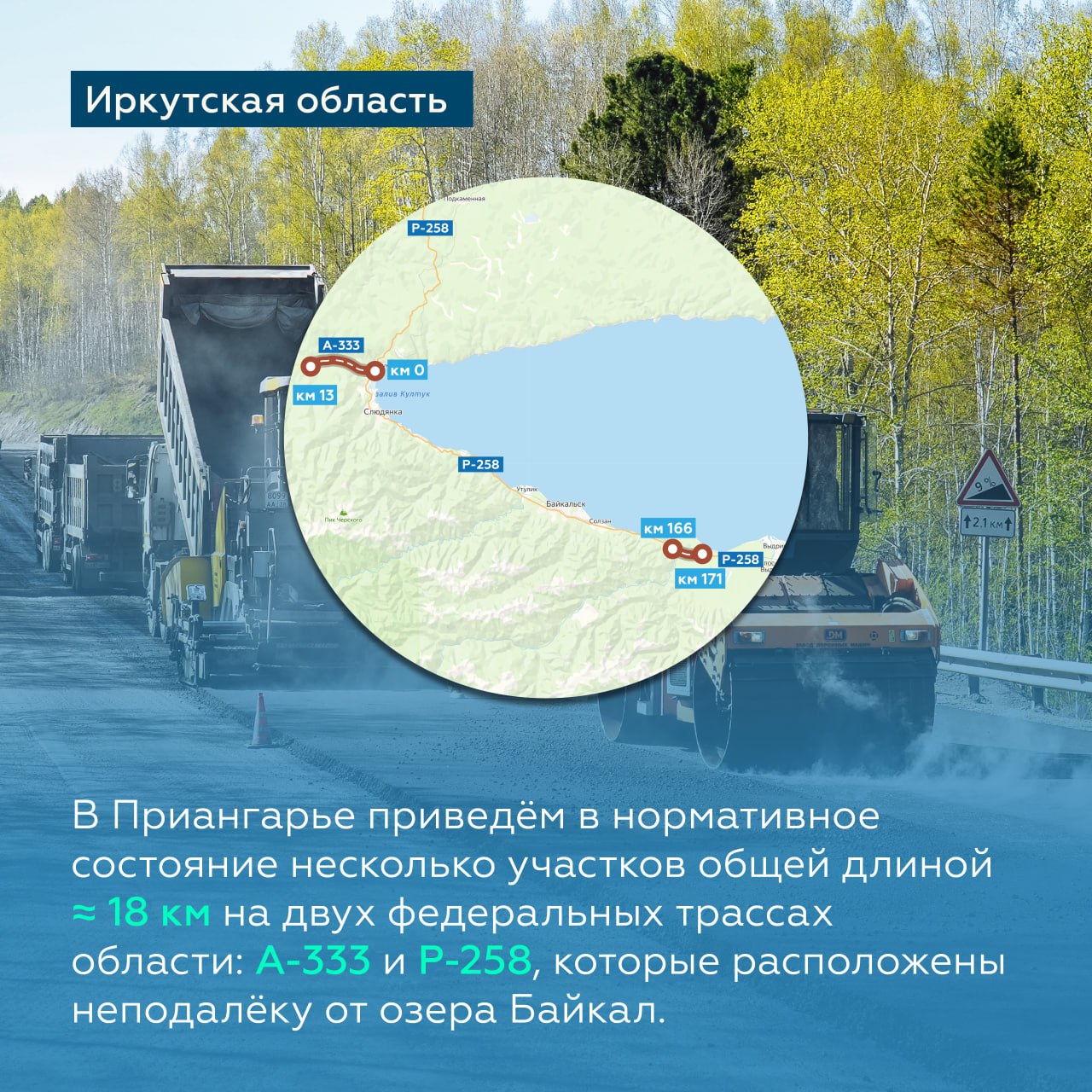С началом очередного дорожно-строительного сезона мы приступим к устройству слоёв износа на Р-258 «Байкал» и А-333 — ключевых объектах регионов.