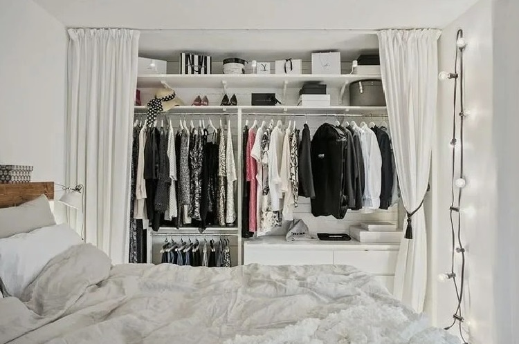 Стоит задуматься, насколько подходит такая гардеробная в спальне. Возможно, лучше создать строгое разделение между зоной отдыха и местом для одежды. Хорошее качество сна стоит больше, чем очередь из красивых вещиц.