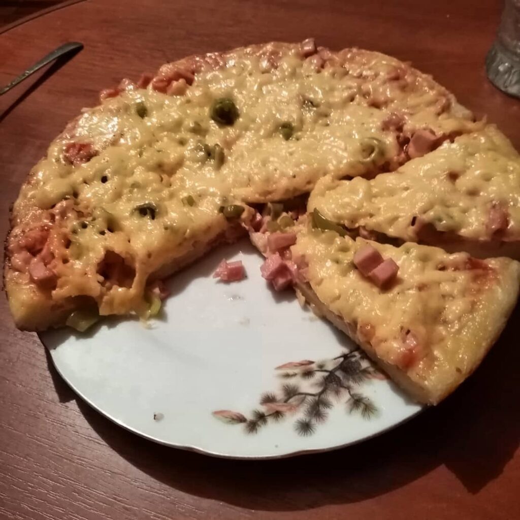 Начинка состоит из нарезанной кубиками колбасы, кружочков помидоров и натертого сыра. Соус готовится путем смешивания майонеза с томатной пастой. Разогреть сковороду с растительным маслом, вылить тесто, сверху распределить соус, затем уложить начинку и посыпать сыром. Опекать на медленном огне под крышкой около 10 минут, затем снять крышку, чтобы сыр расплавился, а корочка подрумянилась.