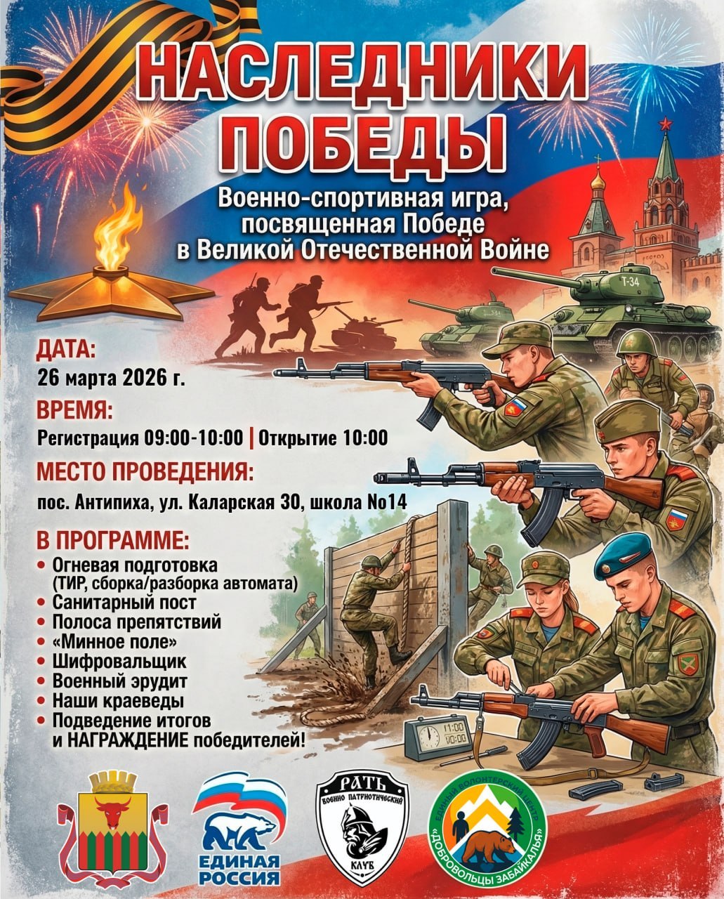 В Антипихе 26 марта пройдет военно-спортивная игра «Наследники Победы», посвященная Победе в Великой Отечественной войне — организаторами выступили военно-патриотический клуб «Рать» в сотрудничестве с партией «Единая Россия» и Единым волонтерским центром «Добровольцы Забайкалья», а также администрация столицы Забайкалья.