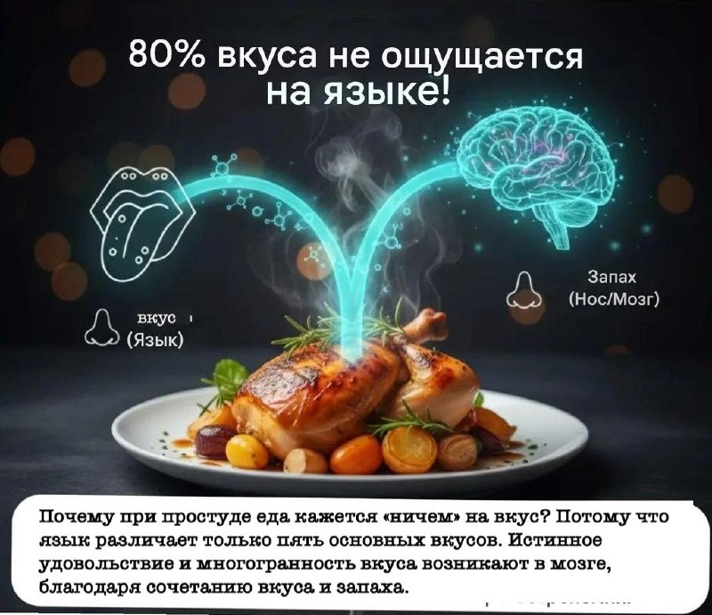 Восприятие вкуса — это не только работа вкусовых рецепторов на языке. Научные исследования показывают, что до 80% нашего ощущаемого вкуса формируется благодаря другим органам чувств, главным образом, обонянию.