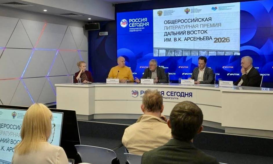 (На фото организаторов проекта: презентация восьмого сезона Общероссийской литературной премии «Дальний Восток» имени Владимира Арсеньева в Международном мультимедийном пресс-центре «Россия сегодня»).