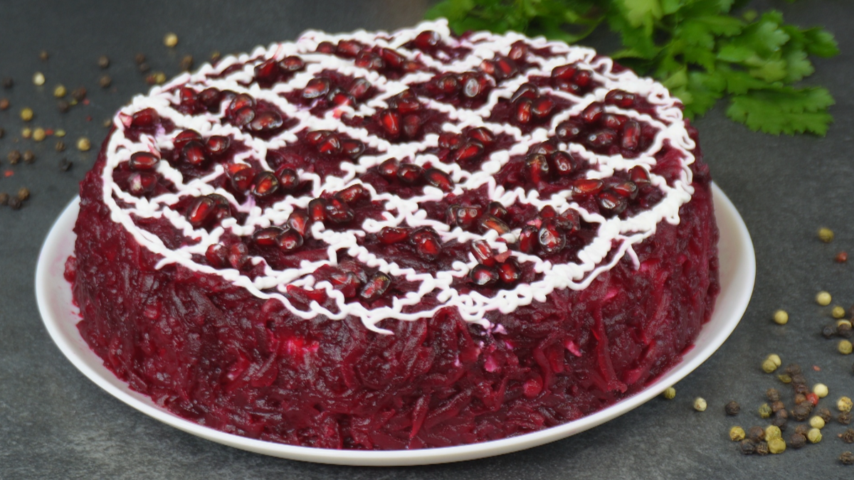 Салат можно оформлять как тортик, украсив его майонезом и, на свой вкус, зернами граната или другими элементами декора.