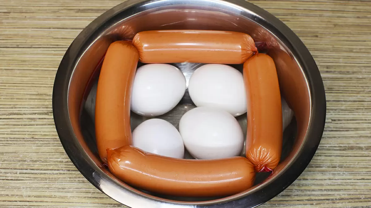 Далее переходим к созданию самой начинки. На разогретой сковороде с добавлением масла обжарьте нарезанные сосиски до золотистого состояния. Затем влейте яичную смесь и на среднем огне жарьте, пока яйца не схватятся. Перемешивайте ингредиенты, чтобы получить нежную консистенцию.