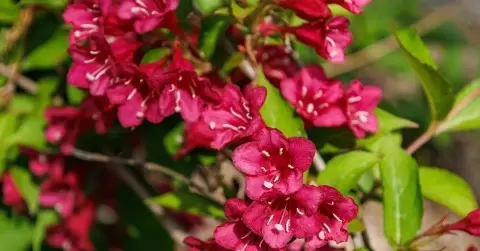 Весной вейгела покрывается великолепной жесткой зеленой листвой, а в майские дни радует глаз ярко-красными цветами. Благодаря этому кустарник оживляет любые уголки сада. Не редкость и повторное цветение в конце лета.