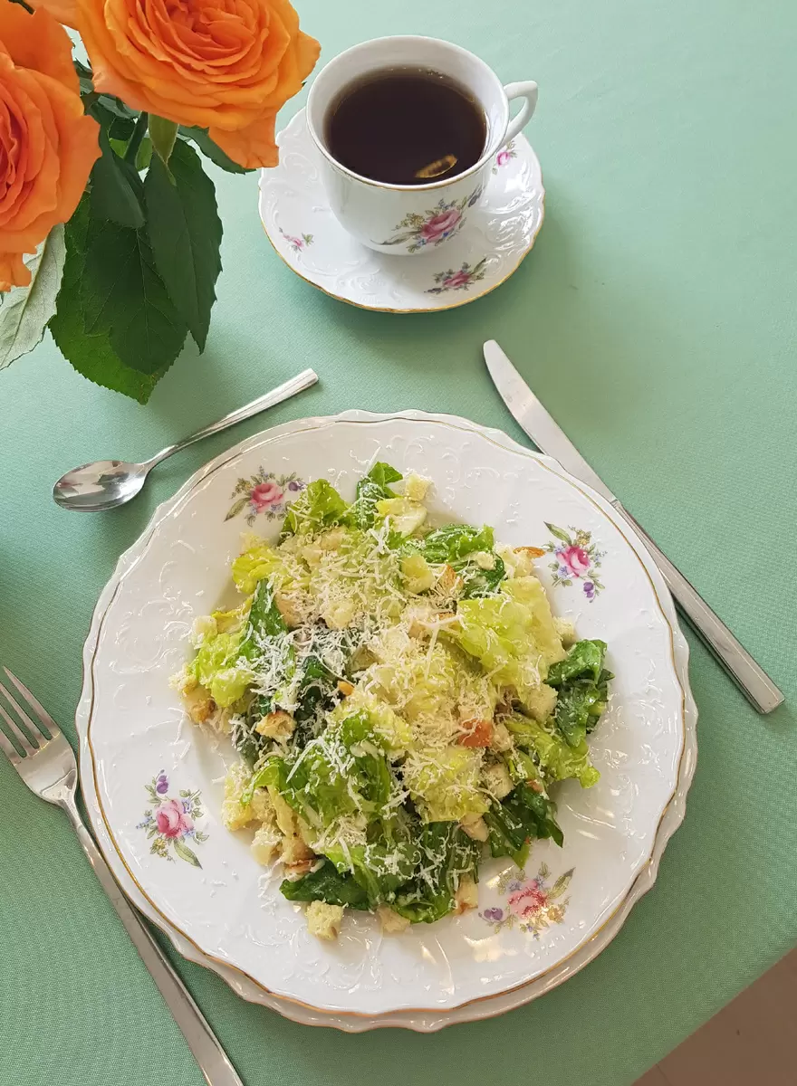 Как только заправка готова, следует нарезать листья салата крупными кусками и полить их приготовленной заправкой, аккуратно перемешивая. Пармезан натирается на мелкой терке и добавляется к салату, его необходимо хорошо соединить с остальными ингредиентами. В последнюю очередь в салат добавляются сухарики, что придаст ему особую хрустящую текстуру.