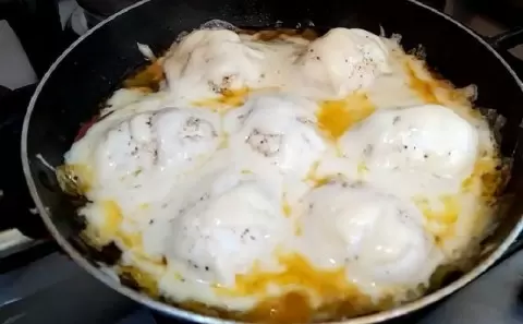 6. Посолите яйца, посыпьте тертым сыром и накройте крышкой, чтобы сыр расплавился и образовал аппетитную корочку.