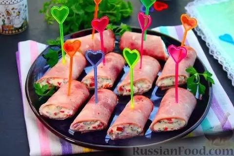 - Рулетики из ветчины с творожным сыром. Это легкая закуска, сочетающая сладкий перец и творожный сыр. С помощью простой подачи, они выглядят стильно и привлекательно на столе.
