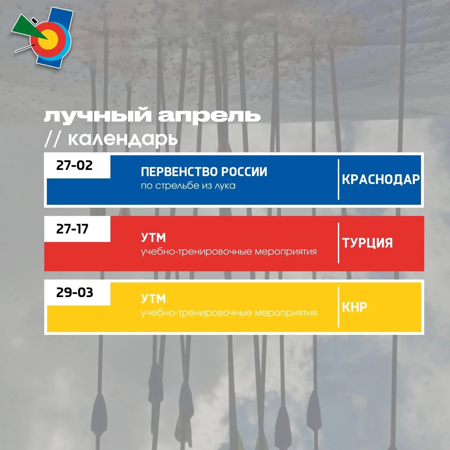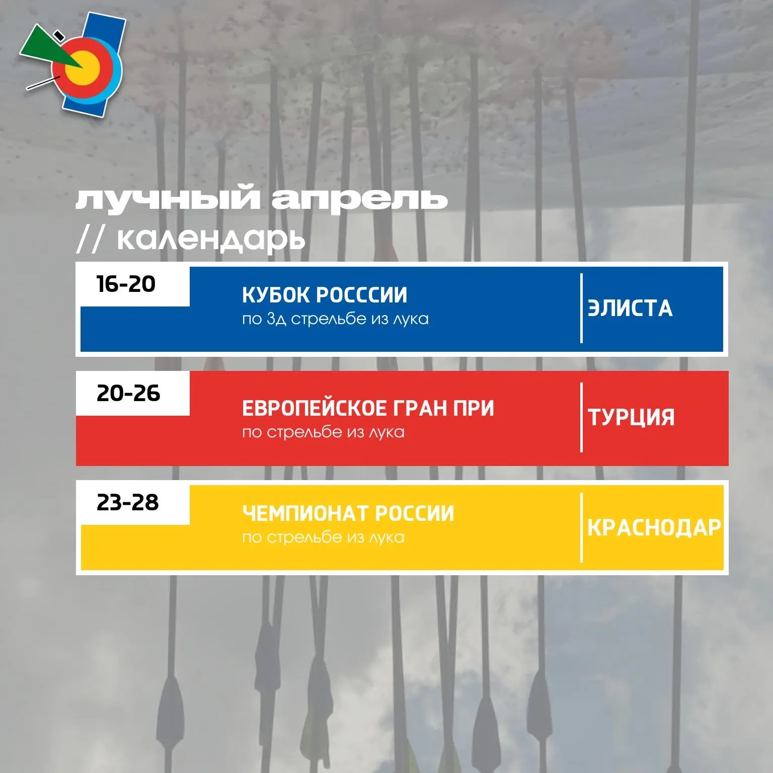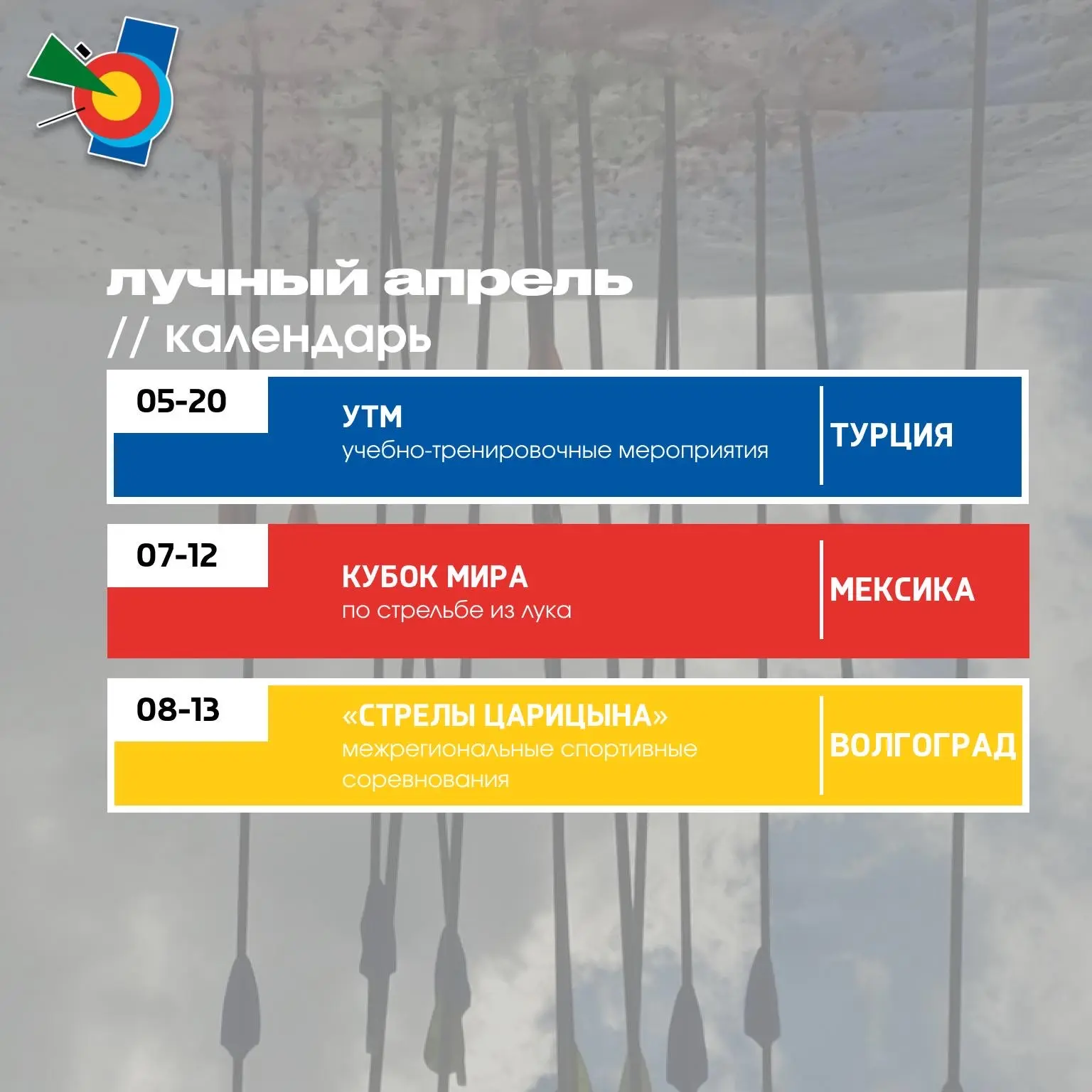 Наших спортсменов ждут тренировочные сборы в солнечной Турции и колоритном Китае, международные выезды на Кубок мира в Мексику и на Европейское Гран-При в Турцию, а также крупные старты на родине — Чемпионат и Первенство России в Краснодаре, серия турниров по 3Д стрельбе из лука в Элисте и межрегиональный турнир в Волгограде.