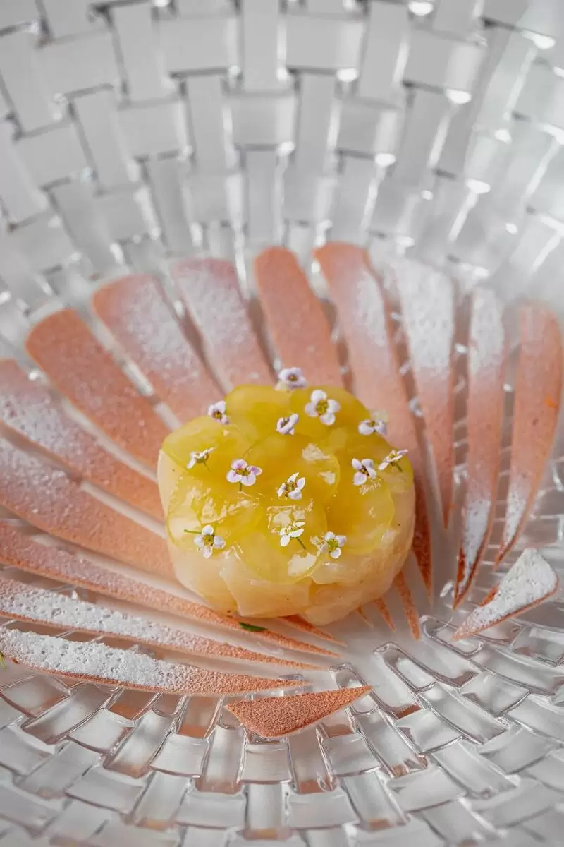 Первым аккордом в этом кулінарном приключении становится тартар из дальневосточного гребешка. Этот шелковистый морепродукт подается с изысканным айоли на основе тунца, виноградом, который предварительно маринуется в соевом соусе и соке юдзу.