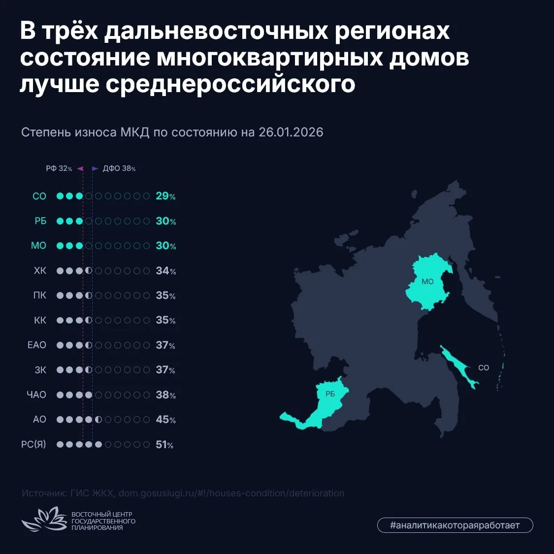 По данным на начало 2026 года, средний уровень износа многоквартирных домов по России составляет 32%, тогда как в Дальневосточном федеральном округе — 38%. При этом в Сахалинской области показатель равен 29%, в Бурятии и Магаданской области — по 30%.