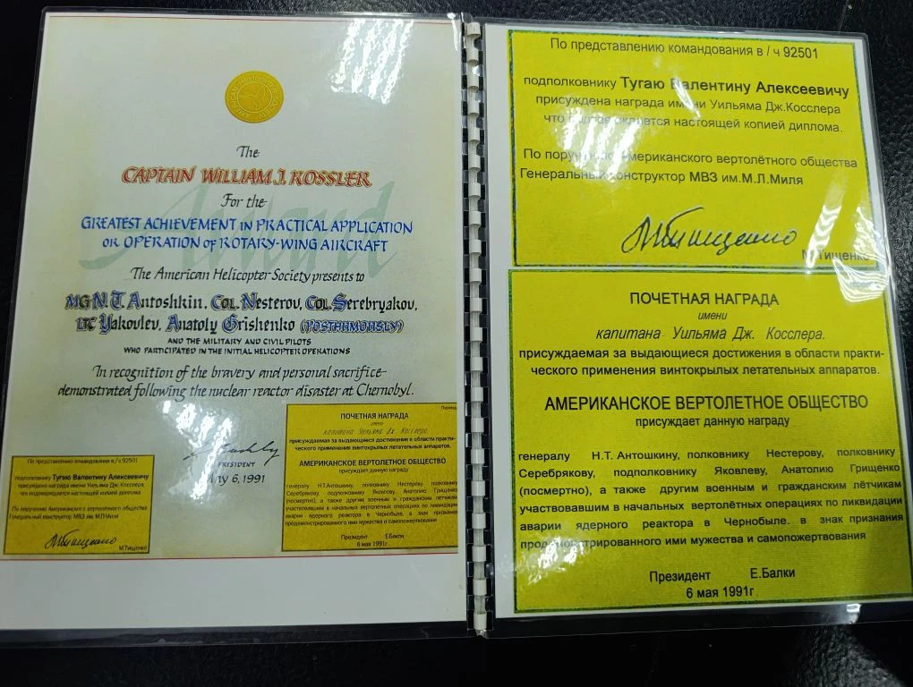 Подвигом русских летчиков в то время вдохновились американцы. Валентин Тугай показал почетную грамоту американского вертолетного сообщества имени капитана Уильима ДЖ. Косслера, которую получил от иностранцев. Такой же наградили и других членов команды, некоторых из них - посмертно.