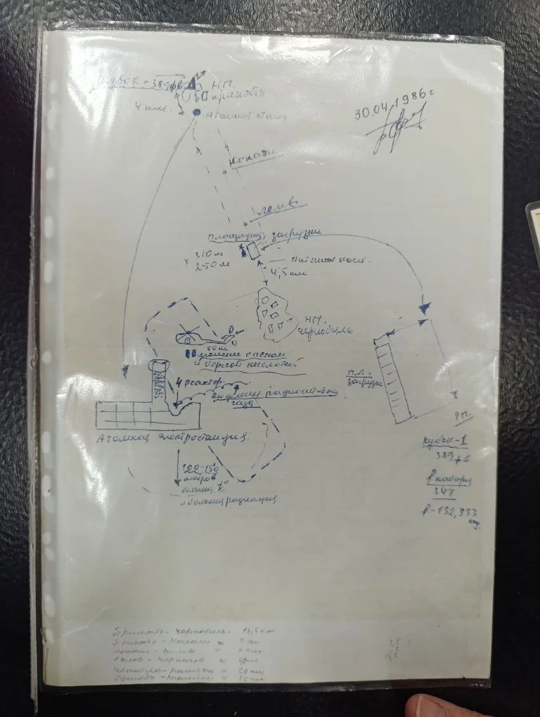 Валентин Тугай показал очки, которые надевал, отправляясь на задание. Они защищали глаза летчиков от ядерных вспышек, превышающие мощность солнечных в несколько раз. А также листок со схемой полетов летчиков – на нем стоит дата «30.04.1986 г.», написанная шариковой ручкой.