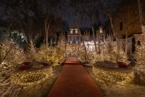 Пока Москва с нетерпением ждет первого снега, ресторан Butler уже полностью погрузился в атмосферу зимнего волшебства. Внутренний двор старинного особняка превратился в сказочный, заснеженный лес, где живые ели и сверкающая карусель создают настроение праздника. Интерьеры залов переполнены волшебством: здесь мерцают гирлянды, а праздничный декор дополняет атмосферу уюта, создавая уникальную обстановку.
