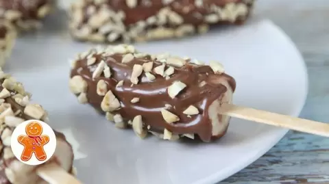 4. После заморозки достаньте бананы из морозилки и обмакните их в шоколад. При необходимости выравните глазурь ложкой, чтобы всё выглядело аккуратно.