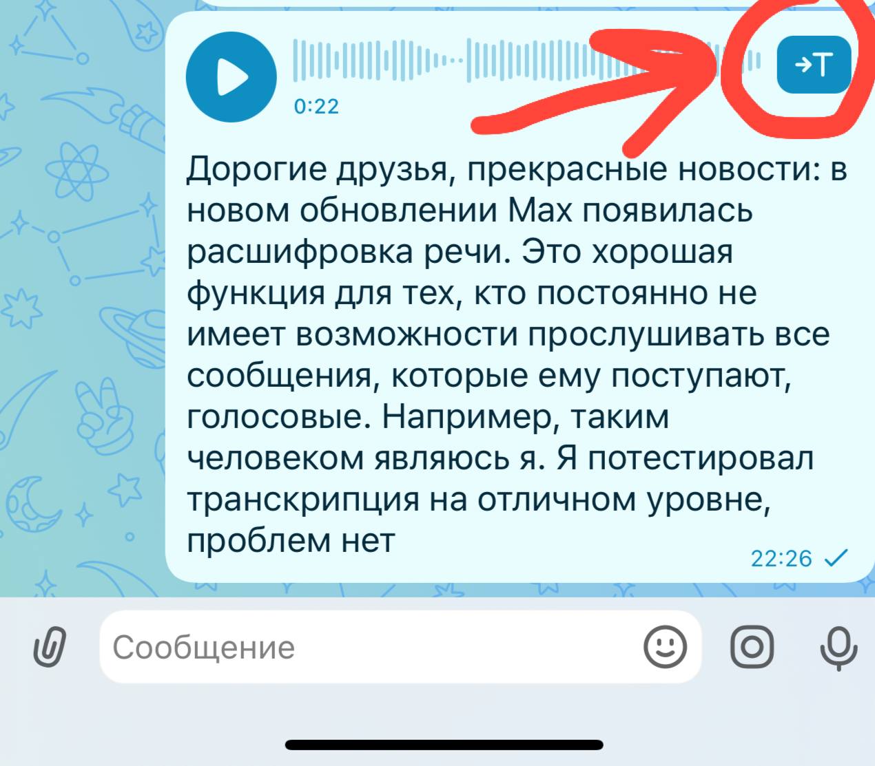 Если у вас не появилось заветной буквы "Т" на голосовых сообщениях - просто обновите МАХ и она появится.