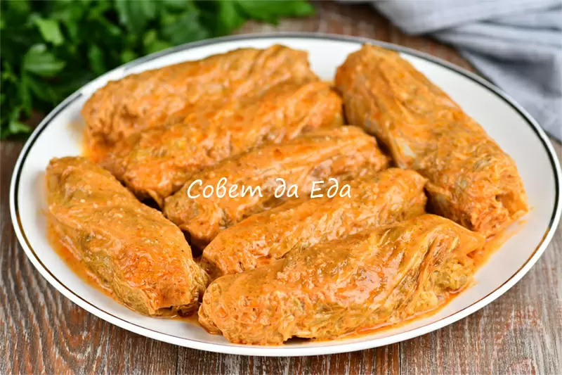Потребуется семь листьев пекинской капусты. Отрезав нежные части, их следует заполнить заранее приготовленным фаршем — 650 грамм (например, говяжьим) с добавлением соли и перца. Фарш равномерно распределяется на листья и аккуратно заворачивается в рулетики, при этом края остаются незакрытыми. Рулетики помещаются в высокую сковороду, где их заливают соусом из сметаны, томатной пасты, сушеного чеснока и специй, и тушат на слабом огне. Итог: сочные рулетики с насыщенным мясным вкусом.