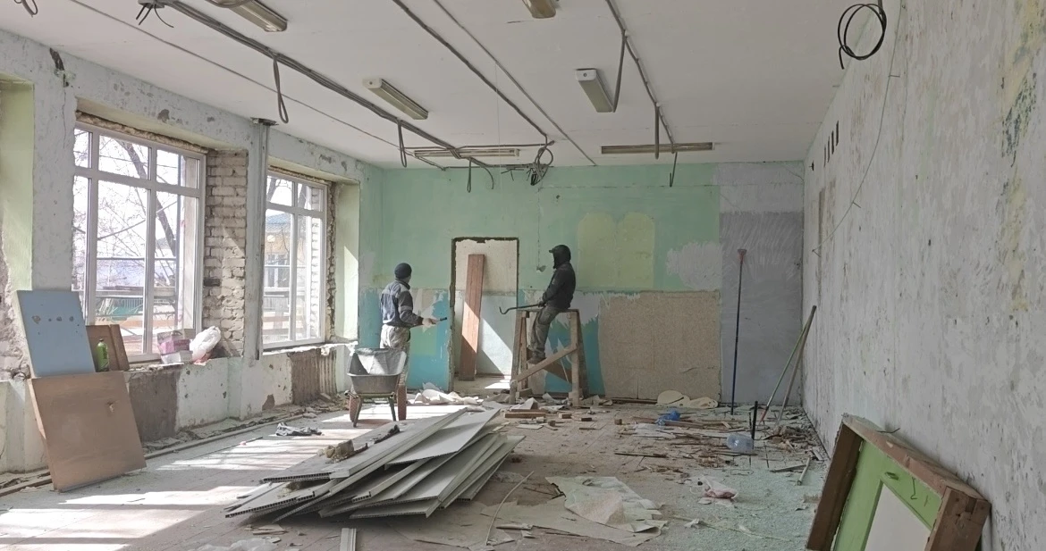 Подрядчик Михаил Витоняк сообщил, что на данный момент происходят демонтажные работы: ведется отбивка штукатурки со стен и разбор полов на первом этаже. Одновременно на втором этаже оштукатуривают стены. Полы уже уложены и застелены фанерой, идет монтаж электрики. Также производятся работы по отделке фасада, утеплитель уже уложили, монтируют систему отопления. Общая готовность объекта составляет 20%.