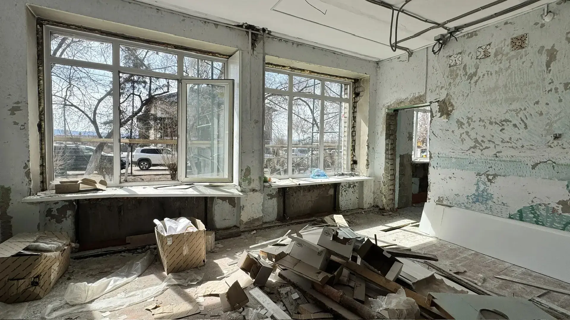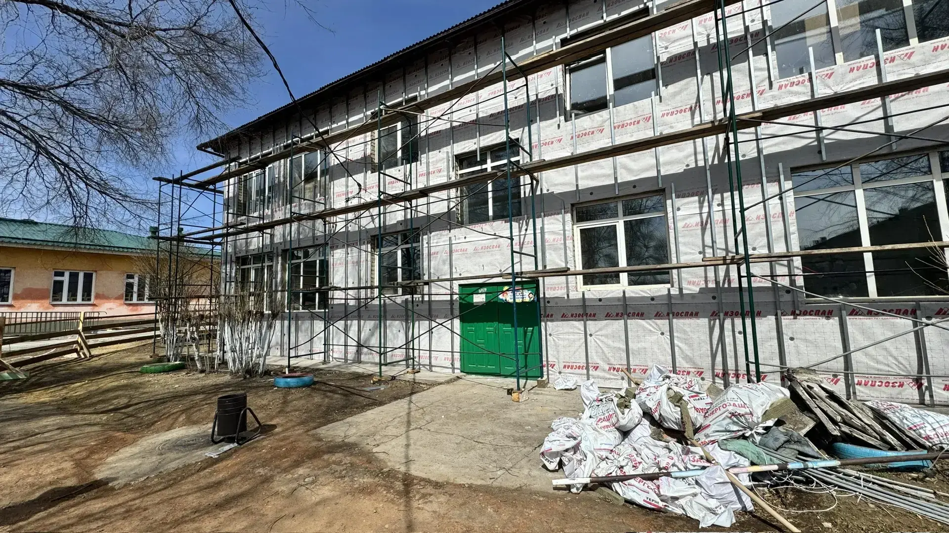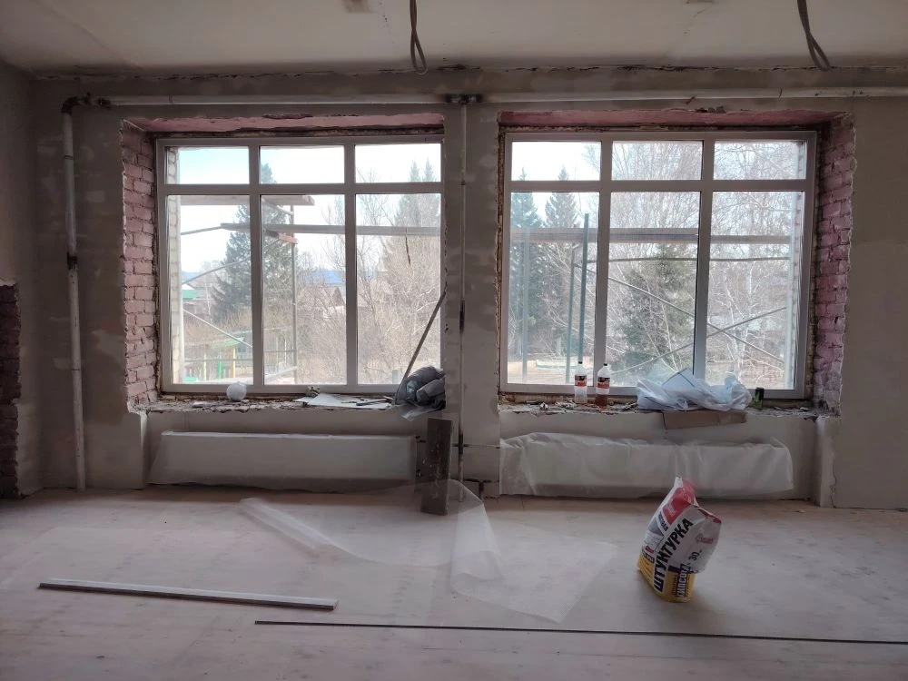 Подрядная организация уже демонтировала старые полы, штукатурку, систему отопления, идут работы по утеплению фасада. Предусмотрены работы по благоустройству территории.