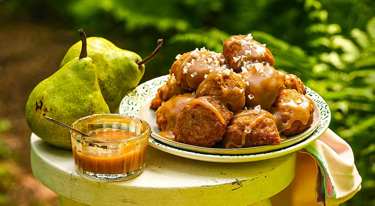 Начать стоит с простого теста: оно приятно поднимается, давая пончикам пышность и воздушность. В начинку идут груши, нарезанные мелкими кубиками, которые сначала карамелизируют на сковороде, затем охлаждают — чтобы текстура сохранялась после жарки. Обжарка во фритюре даёт ровную золотистую корочку и сохраняет влажность внутри, а тёплая солёная карамель связывает все элементы во вкусовой баланс.